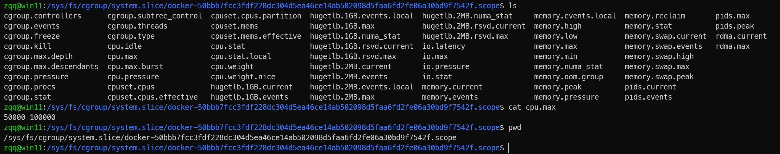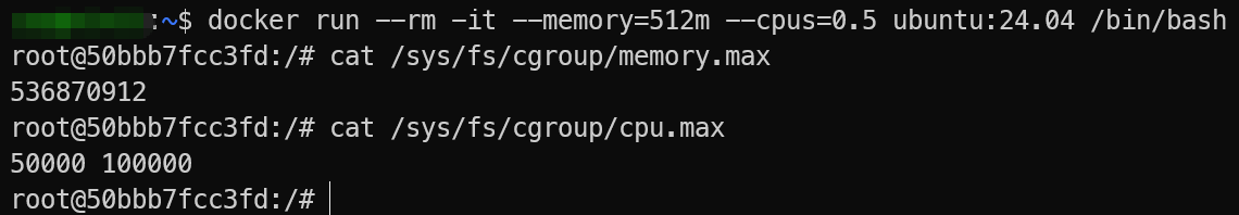 docker run --memory=512m --cpus=0.5,Docker Daemon 会在宿主机的/sys/fs/cgroup下为容器创建一个子目录,表示一个cgroup子树,例如:/sys/fs/cgroup/system.slice/docker-<container-id>.scope宿主机侧写入限制