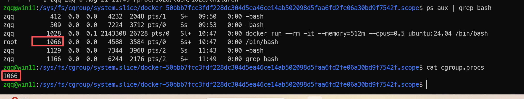 echo 536870912 > /sys/fs/cgroup/system.slice/docker-<container-id>.scope/memory.max # 限制内存 512MB echo "50000 100000" > /sys/fs/cgroup/system.slice/docker-<container-id>.scope/cpu.max # 限制 0.5CPU把容器进程的 PID 加入到这个 cgroup