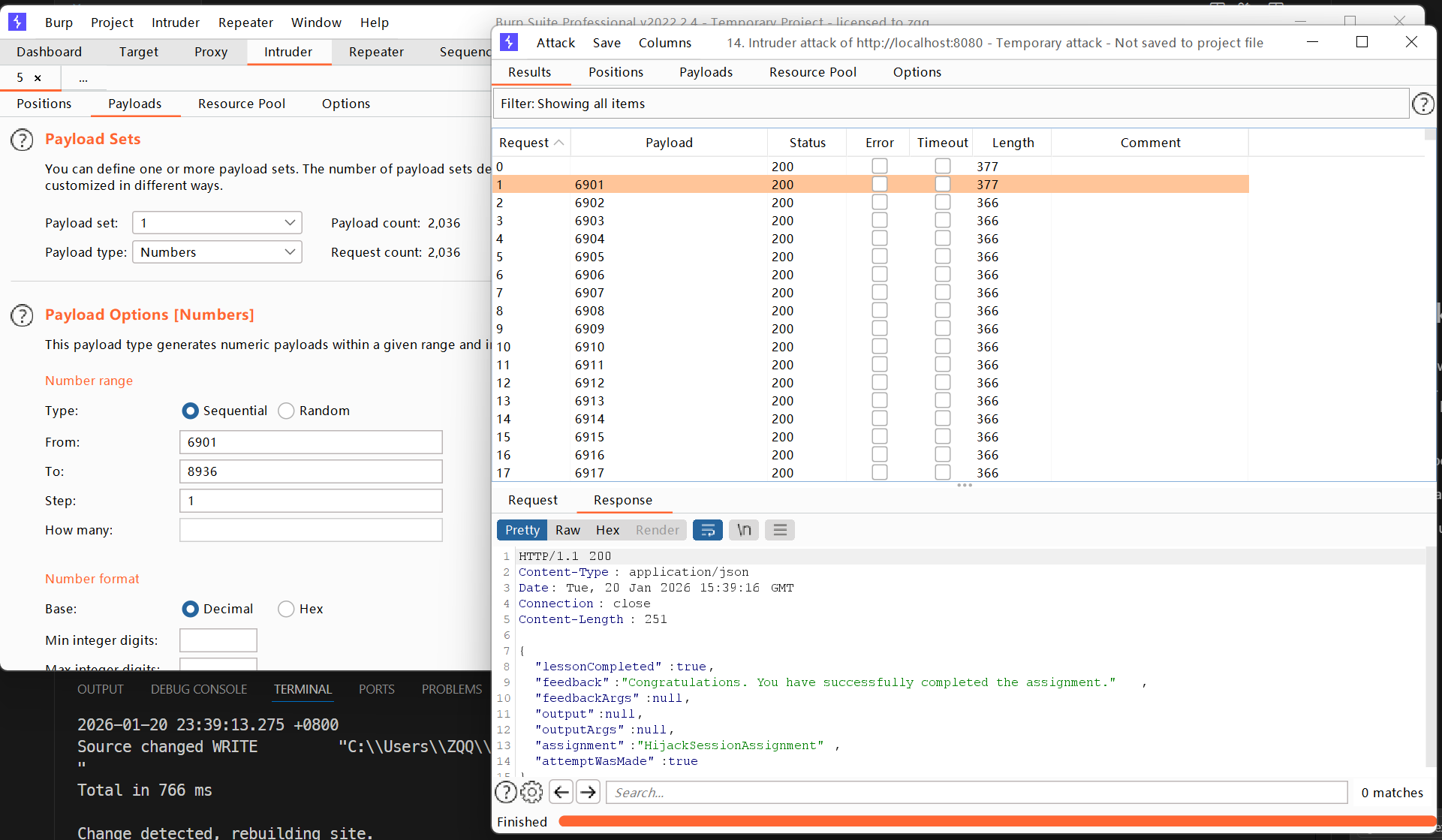 右键Send to Intruder,Payloads选择Numbers,From 6901 to 8936,Start attack(注意攻击速率不要太快,会导致数据库错误)