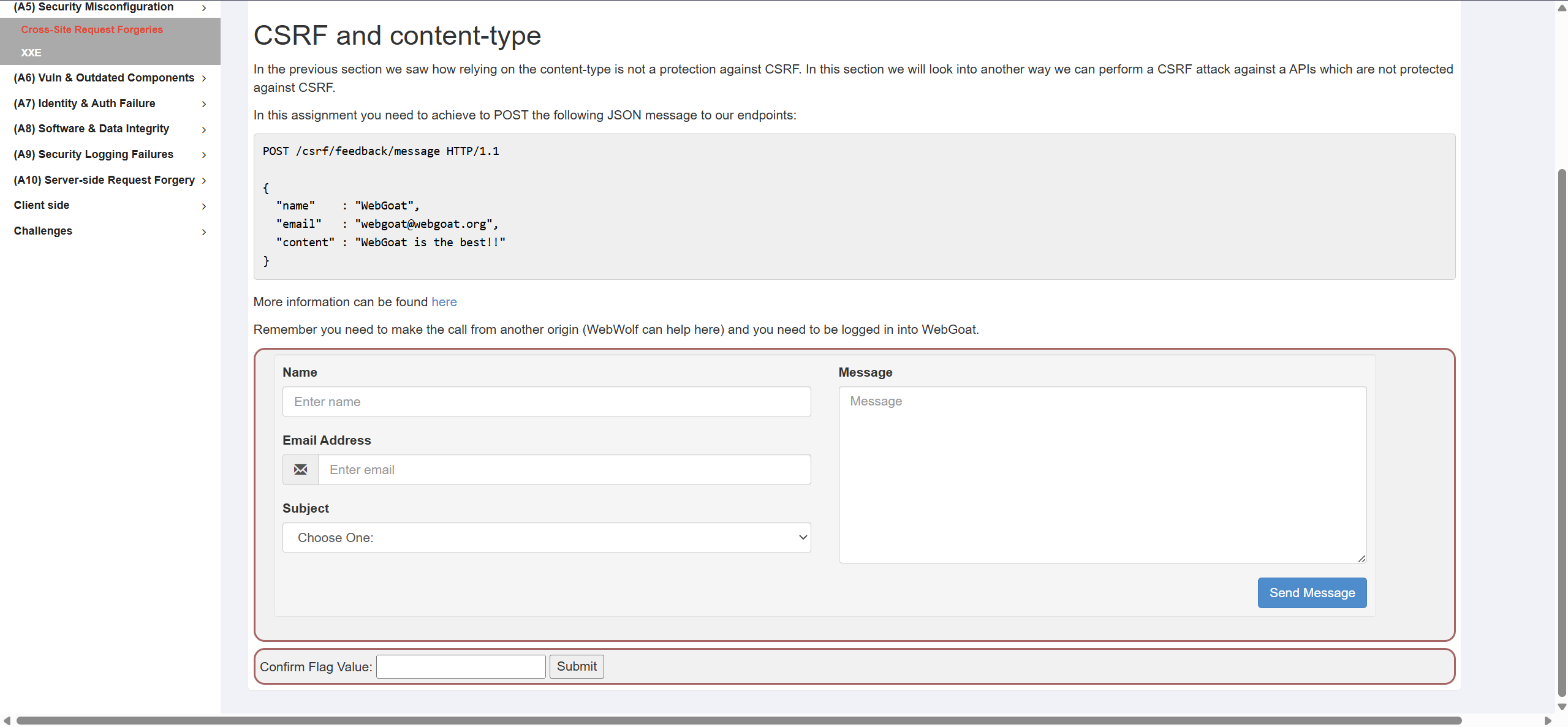 <form name="feedback" enctype="text/plain" action="http://localhost:8080/WebGoat/csrf/feedback/message" method="POST">